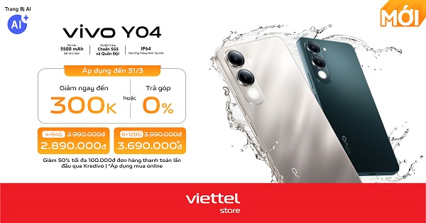 - vivo Y04 (4GB/64GB) giảm chỉ còn 2.890.000đ (giá bán lẻ 2.990.000đ)