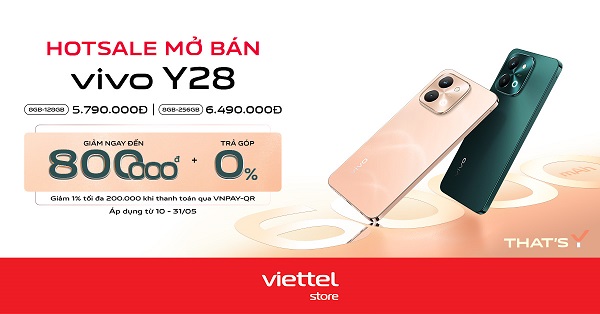 Từ ngày 10/05 đến 31/05/2025, Viettel Store triển khai chương trình hotsale mở bán Vivo Y28 giá bán lẻ chỉ từ 5.790.000đ, giảm ngay đến 800.000đ. Xem chi tiết đặt mua ngay chiếc smartphone pin siêu khủng với giá tiết kiệm đến bất ngờ nhé!