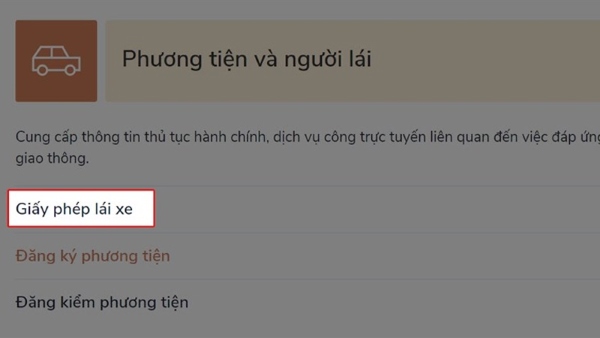 Bước 3: Chọn tiếp mục “Giấy phép lái xe”.