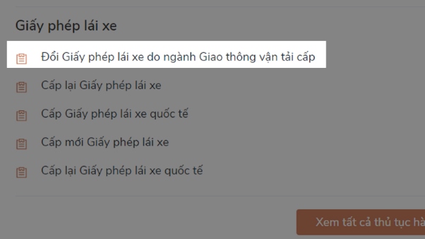 Bước 4: Chọn vào “Đổi giấy phép lái xe do ngành Giao thông vận tải cấp”.
