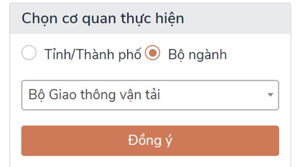 Bước 5: Tại mục “Chọn cơ quan thực hiện” tại phía bên phải màn hình, bạn chọn “Tỉnh/ Thành phố” hay “Bộ ngành” tương ứng. Sau đó, bạn nhấn Đồng ý.