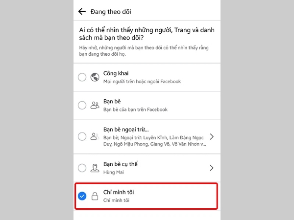 Bước 4: Chọn Chỉ mình tôi để không ai có thể thấy được những người bạn đang theo dõi trên Facebook là xong.
