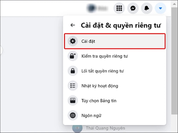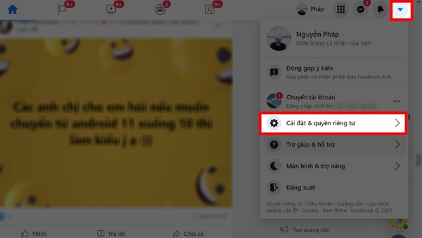 Bước 1: Mở Facebook trên máy tính của bạn > nhấn vào biểu tượng Tam giác ngược > > chọn Cài đặt & quyền riêng tư.