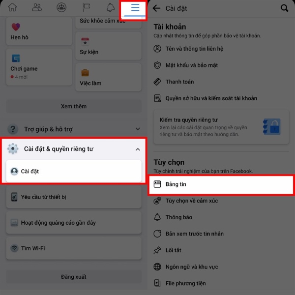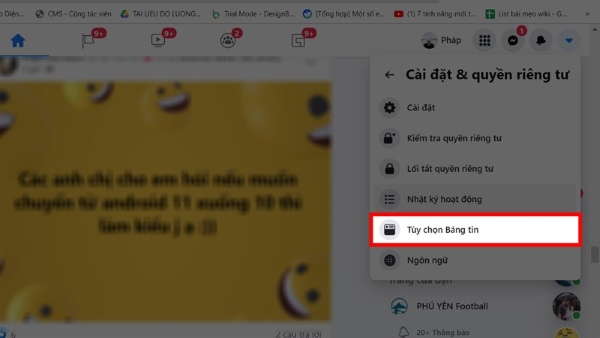 Tại màn hình tiếp theo và nằm trong mục Tùy chọn bạn hãy chọn vào mục Bảng tin để đến với bước tiếp theo trong quá trình bỏ theo dõi hàng loạt trên Facebook của bạn nhé.
