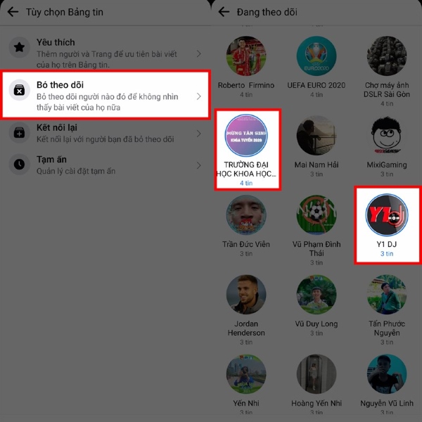 Bước 2: Một bảng gồm nhiều tùy chọn cho bảng tin sẽ hiện ra để bạn bỏ theo dõi hàng loạt. Bạn hãy chọn vào tùy chọn Bỏ theo dõi. Sang tới giao diện màn hình tiếp theo, bạn chọn vào những người, trang, nhóm,… mà không muốn tiếp tục theo dõi nữa là được. Những mục được chọn sẽ có 1 vòng xanh xung quanh khác với các mục còn lại vẫn được theo dõi đó.
