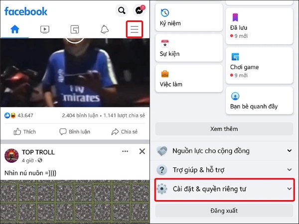 Bước 1: Trước tiên bạn nhấn chọn vào biểu tượng 3 gạch ngang ở phía trên màn hình để mở ra bảng gồm có các công cụ tiện ích, cài đặt, bảo mật,… rồi chọn tiếp vào mục Cài đặt & quyền riêng tư > Cài đặt.