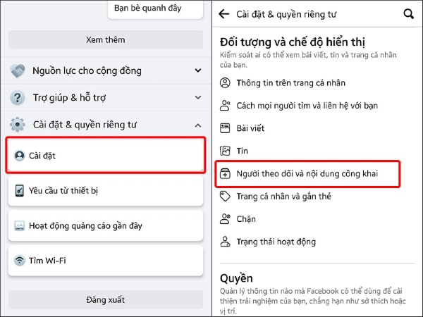 Bước 2: Nhấn vào phần Cài đặt > trong phần Đối tượng và chế độ hiển thị bạn nhấn vào mục Người theo dõi và nội dung công khai.