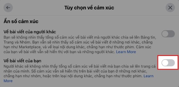 Bước 4: Nhấn vào biểu tượng nút gạt tại mục Về bài viết của bạn để có thể ẩn số lượt like trên Facebook là xong.