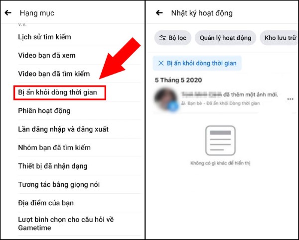 Bước 3: Kéo xuống bên dưới và chọn Bị ẩn khỏi dòng thời gian. Các bài viết đã ẩn sẽ được hiển thị một cách chi tiết.