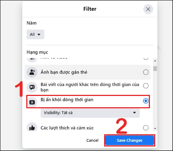 Bước 4: Kéo xuống bên dưới chọn Bị ẩn khỏi dòng thời gian > Ấn Save Changes để hoàn tất thao tác.