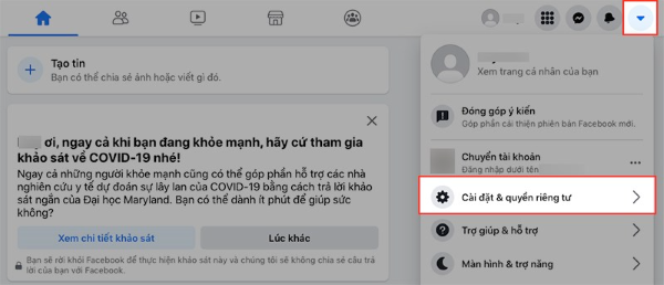 Bước 1: Đăng nhập trang cá nhân Facebook > Chọn vào biểu tượng hình tam giác > Chọn mục Cài đặt & quyền riêng tư.