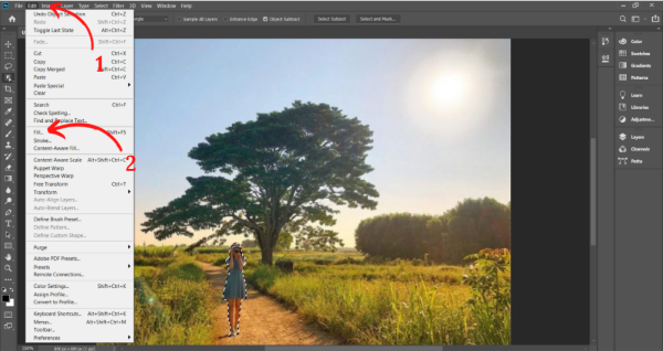 Bước 2: Ấn chọn vào mục Edit > chọn vào Fill (phím tắt Shift+F5) để khởi chạy công cụ Content – Aware Fill.
