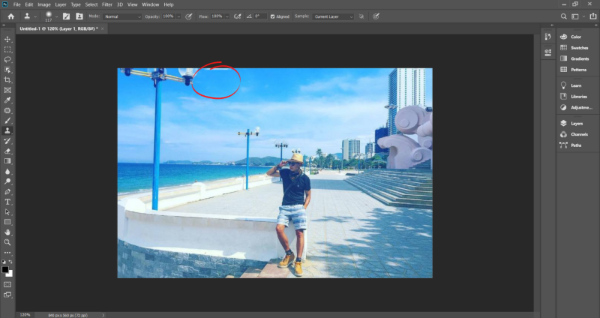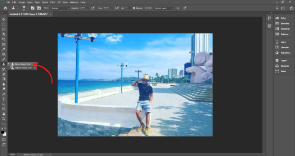 Bước 1: Chọn hình ảnh cần xóa vật thể. Sau đó tìm và chọn vào công cụ Clone Stamp Tool ở vị trí trên thanh công cụ.
