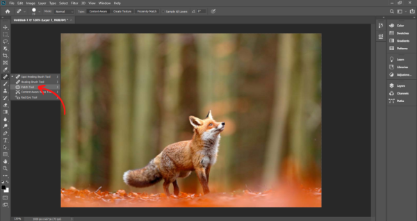 Bước 1: Chọn hình ảnh bạn muốn thực hiện xóa vật thể. Trên thanh công cụ tìm và chọn vào biểu tượng của Patch Tool.