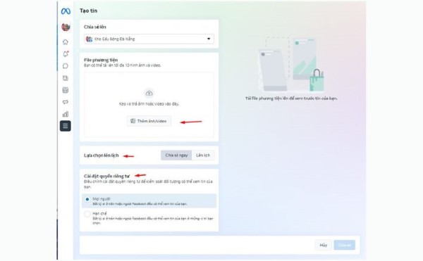 Bước 3: Chọn tiếp đến tính năng Thêm ảnh/video để làm nền cho story chứa địa chỉ URL. Bạn cũng có thể tùy chọn Chia sẻ ngay hoặc Lên lịch và Cài đặt quyền riêng tư của story đăng tải.