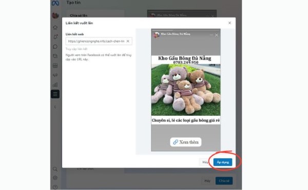 Bước 4: Chọn Thêm liên kết > Lúc này giao diện màn hình mới hiện ra bạn dán địa chỉ URL cần chèn vào story > Chọn tiếp Áp dụng.