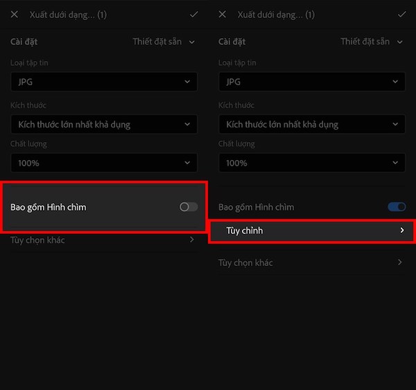 Bước 4: Tại mục Bao gồm Hình chìm thì bạn hãy bật công tắc lên rồi ấn tiếp vào ô Tùy chỉnh sau khi công tắc được bật lên để có thể chỉnh logo, watermark được gắn.