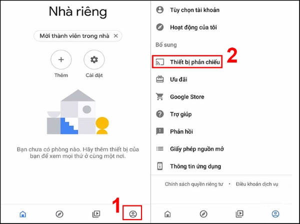 Bước 2: Tại ứng dụng Google Home, bạn mở tab Account > chọn Thiết bị phản chiếu.