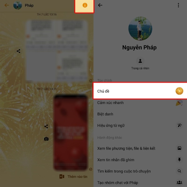 Bước 2: Chờ đợi một lát để ứng dụng Messenger hoàn tất cập nhật. Sau đó, bạn mở ứng dụng lên và đi tới các cuộc trò chuyện muốn để đổi chủ đề Tết > nhấn chọn vào biểu tượng chữ “i” nằm trên menu ở góc bên phải màn hình hoặc bạn chọn vào tên tài khoản của người dùng nằm phía trên cùng. Tại mục Tùy chỉnh, bạn chọn vào Chủ đề.