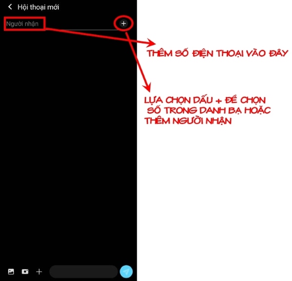 Bước 2: Khi cửa sổ tin nhắn mới mở ra, bạn có thể nhập số điện thoại người nhận hoặc nhấn nút + cạnh khung nhập số để chọn người nhận từ danh bạ. Bạn cũng có thể gửi tin nhắn đến nhiều người cùng lúc bằng cách này.