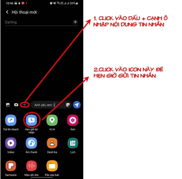Bước 3: Sau khi đã chọn người nhận và soạn xong nội dung tin nhắn, nhấn vào dấu + cạnh khung nhập nội dung và chọn Hẹn giờ tin nhắn.
