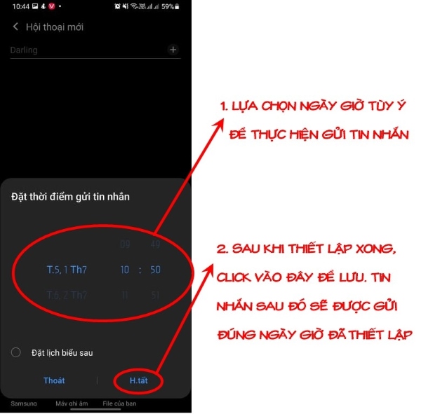 Bước 4: Một bảng thông báo sẽ xuất hiện, cho phép bạn chọn thời điểm gửi tin nhắn. Sau khi thiết lập xong, tin nhắn sẽ được gửi đúng vào thời điểm bạn đã chọn. Bạn có thể hẹn giờ gửi tin nhắn Android trong vòng một năm.