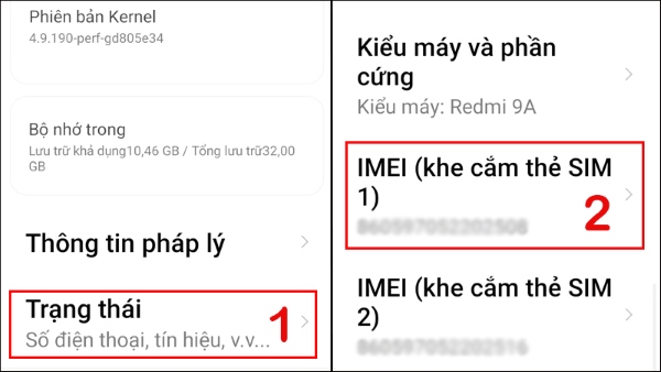 Bước 2: Chọn Trạng thái > trên màn hình sẽ hiển thị 2 dãy số IMEI > lấy IMEI đầu tiên (IMEI 1).