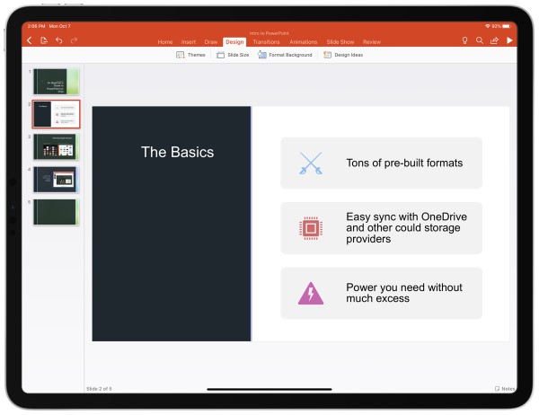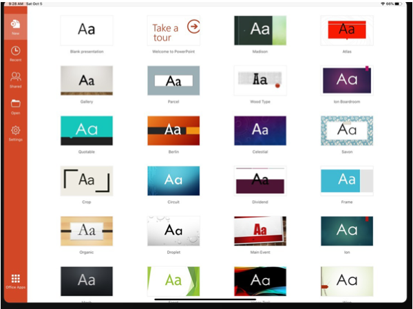 Thao tác với bản trình bày trong ứng dụng PowerPoint dành cho các thiết bị iPad rất giống với thao tác PowerPoint trên nền tảng hệ điều hành Windows. Bạn có thể chọn làm việc từ đầu hoặc tạo bản trình bày từ một mẫu có sẵn. Bạn có quyền truy cập các công cụ định dạng tương tự có sẵn trong ứng dụng PowerPoint một cách độc lập. Bạn có thể thêm Ghi chú và Nhật xét, thậm chí là tiến hành tự động hóa bản trình bày.