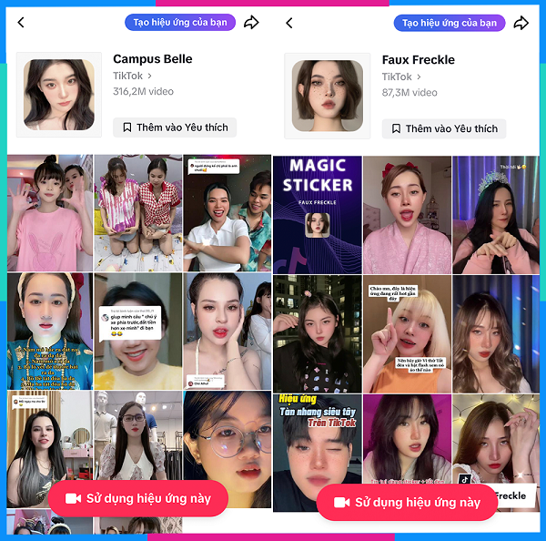 Ngoài ra, TikTok còn cho phép người dùng có thể tiến hành lưu lại những filter mà mình thích. Cách thực hiện rất đơn giản, bạn chỉ cần chọn filter đó sau đó nhấn vào biểu tượng “Hiệu ứng” là được. Lần sau, khi bạn muốn sử dụng lại những filter này, thì chỉ cần vào mục filter đã lưu là có thể sử dụng chúng một cách nhanh chóng mà không phải mất thời gian để tìm giữa hàng trăm filter mà TikTok có.