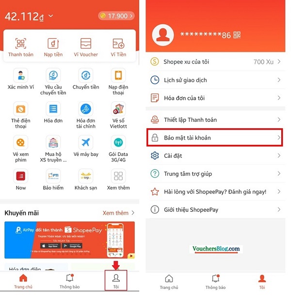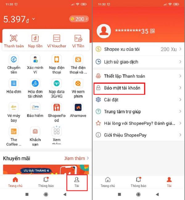 Bước 1: Sau khi mở ứng dụng ShopeePay bạn tiến hành nhấp vào mục “Tôi” nằm ở góc phải phía dưới màn hình. Sau đó bạn nhấn vào phần “Bảo mật tài khoản”.