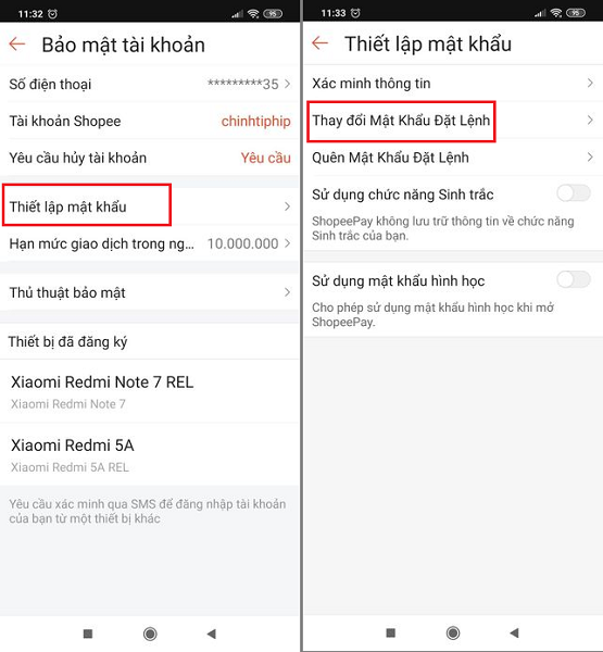 Bước 2: Tại trang đây bạn nhấn vào mục “Thiết lập mật khẩu”, sau đó nhấn vào mục “Thay đổi Mật Khẩu Đặt Lệnh”.
