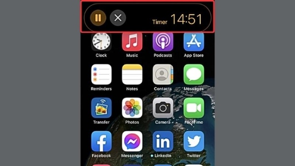 Bước 2: Trên màn hình Dynamic Island sau đó sẽ hiển thị đếm ngược theo phút. Bạn cũng có thể điều khiển bộ hẹn giờ tạm dừng ngay trên Dynamic Island bằng cách nhấn vào biểu tượng 2 gạch dọc, hoặc dừng hẳn bằng cách nhấn vào dấu X là được.