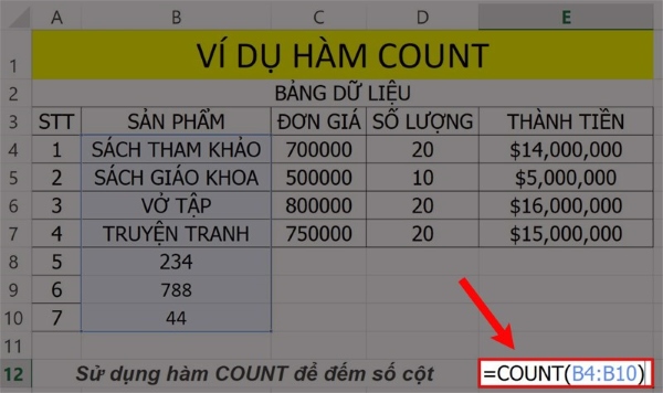 Bước 1: Trên bảng dữ liệu tính Excel, bạn nhập vào hàm “=COUNT(B4:B10)” vào ô tham chiếu mà bạn muốn hiển thị kết quả.