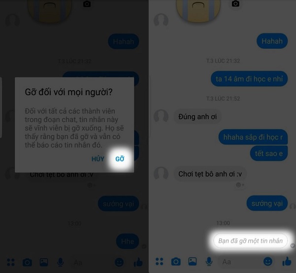 Bước 3: Ứng dụng sẽ xác nhận lại lần cuối xem bạn có muốn gỡ tin nhắn này hay không, người dùng chỉ cần nhấn vào Gỡ là xong. Tiếp đó, trong cuộc trò chuyện sẽ hiện lên thông báo Bạn đã gỡ một tin nhắn.