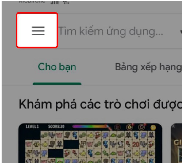 Vào ứng dụng Cửa hàng Google Play > Chọn biểu tượng 3 gạch ngang.