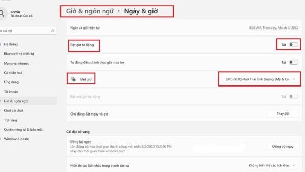 - Sau đó, tắt tính năng Đặt giờ tự động và chuyển đổi sang múi giờ (UTC-08:00) Thái Bình Dương (Mỹ & Canada).