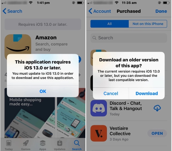 Người dùng có thể thử tải ứng dụng đã mua trên iCloud của mình bằng cách mượn chiếc iPhone của một người khác để đăng nhập vào tài khoản iCloud. Sau đó tải xuống một ứng dụng mà bạn biết rằng không thể tải xuống được trên thiết bị iPhone cũ hơn của mình. Sau khi có được ứng dụng mong muốn, bạn quay lại iPhone cũ và tải xuống ứng dụng tương tự từ danh sách Purchased và vấn đề đã được giải quyết.