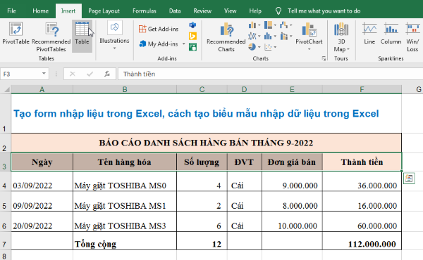 Bước 1: Bôi đen phân vùng tiêu đề đã tạo lúc đầu của file Excel > Chọn thẻ Tạo Form > Chọn vào Form.