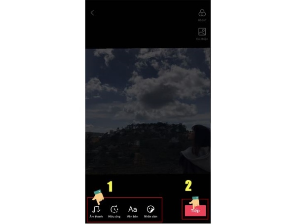Bước 6: TikTok sẽ tự động tạo một video ngắn 15 giây từ ảnh bạn đã chọn. Bạn có thể thêm nhạc, chữ, hiệu ứng, hoặc nhãn dán để video trở nên thú vị và sinh động hơn. Khi hoàn tất, nhấn “Tiếp” để chuẩn bị chia sẻ video.