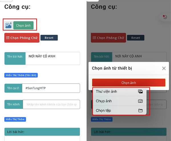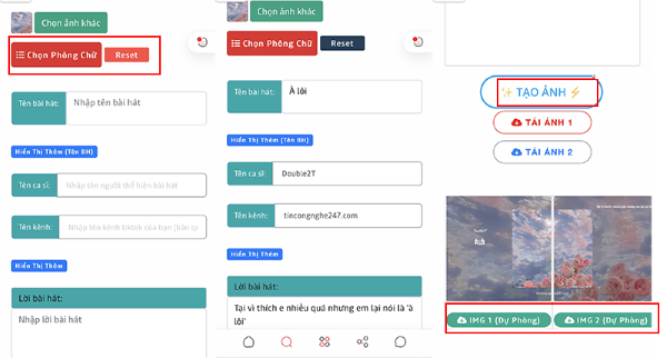 Bước 4: Chọn phông chữ cho lyric > Nhấn nút “Reset” để xóa bài hát mặc định > Nhập “Tên bài hát”, “Tên ca sĩ”, “Tên kênh TikTok của bạn”, và “Lời bài hát” > Nhấn “Tạo ảnh” > Tải ảnh về máy để hoàn tất.