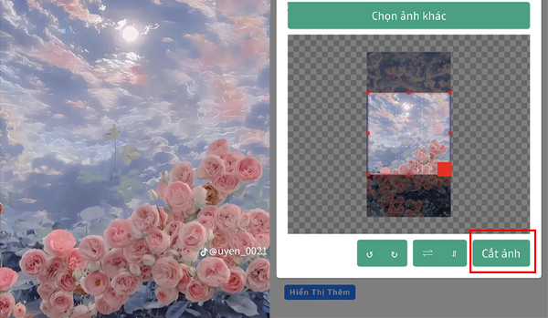 Bước 2: Cắt ảnh tỷ lệ 1:1: Tiến hành cắt ảnh theo tỷ lệ hình vuông 1080x1080px. Chia chiều dài 2160px thành hai phần, kéo ảnh sang mép trái để cắt một ảnh bên trái và kéo sang mép phải để cắt một ảnh bên phải.
