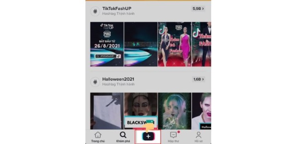 Bước 1: Mở ứng dụng TikTok và nhấn vào biểu tượng dấu cộng (+) ở dưới cùng của màn hình.