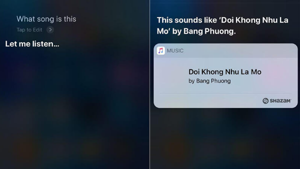 Bạn chỉ cần gọi tên Siri lên và hỏi một câu hỏi đơn giản như: “What song is playing” hay “What song is this” và bật đoạn nhạc bạn muốn tìm tên lên. Sau đó Siri sẽ lắng nghe đoạn nhạc của bạn và đưa ra tên bài hát đang phát. Chỉ bằng những bước đơn giản trên bạn đã có thể tìm cho mình tên bài hát chỉ qua một đoạn giai điệu có sẵn.