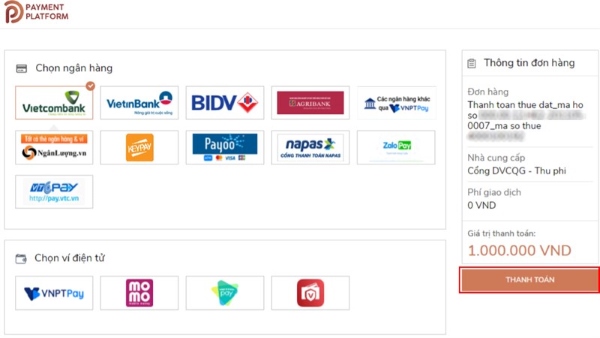 Bước 6: Chọn ngân hàng hoặc ví điện tử, sau đó nhấn “Thanh toán” để hoàn tất thủ tục.