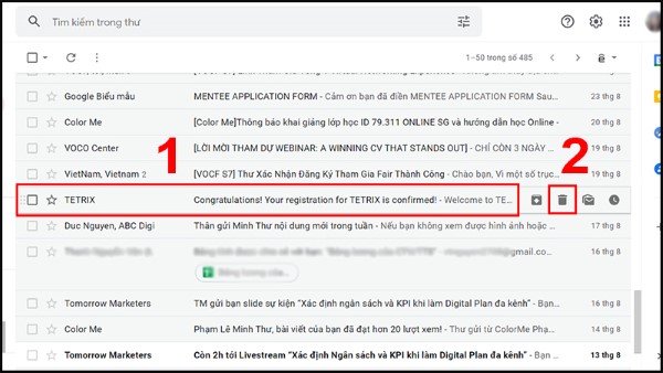 Bước 2: Để con trỏ chuột tại các nội dung thư mà bạn muốn xóa > Chọn vào biểu tượng Thùng rác để thực hiện xóa thư, email.