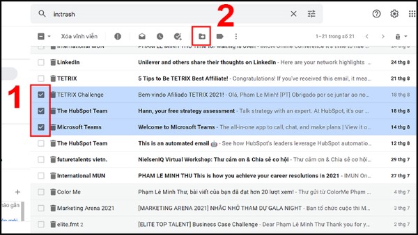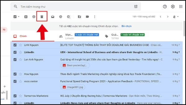 Bước 2: Nhấn chọn biểu tượng những hộp vuông nhỏ nằm ở vị trí bên trái thư email mà bạn cần xóa > Chọn vào biểu tượng Thùng rác để tiến hành việc xóa nhiều tin nhắn email.