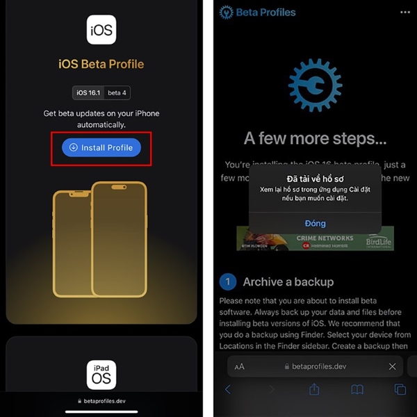 Bước 1: Người dùng truy cập vào trang Beta Profiles theo tại Beta Profiles và chọn mục Install Profile iOS 16.1 Beta 4 bên dưới để tải về điện thoại phiên bản hệ điều hành iOS mới nhất này.