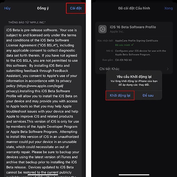 Bước 3: Sau đó, nhấn vào Cài đặt để đồng ý các điều khoản từ Apple Inc và khởi động lại máy rồi đợi hệ thống hoàn tất chạy bước này.