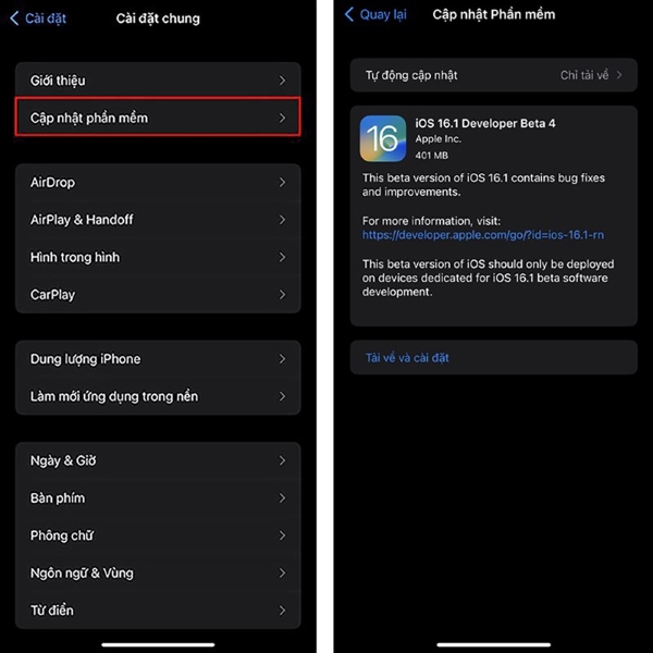 Bước 4: Cuối cùng người dùng mở Cài đặt >> chọn Cài đặt chung >> chọn Cập nhật phần mềm >> chọn Tải về và cài đặt iOS 16.1 Developer Beta 4 để thiết bị tự động tải và cài đặt là xong.