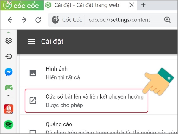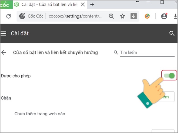 Bước 5: Tại mục tùy chọn Được cho phép, bạn bấm vào công tắc để nó chuyển sang vị trí bên trái. Như vậy, chúng ta đã tiến hành tắt tính năng cho phép các trang web tự động mở hiển thị trên giao diện của trình duyệt web Cốc Cốc. Bạn cũng có thể thực hiện gạt trở lại như là một cách bỏ chặn quảng cáo trên Cốc Cốc